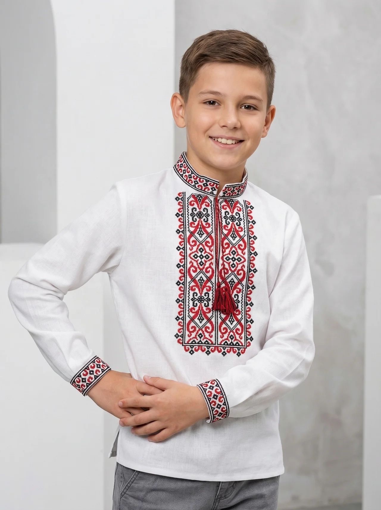 ✅ колір молочний світлий льон, машинна вишивка гладдю червоною та чорною нитками, горловина стійочка, манжети рукава на ґудзиках