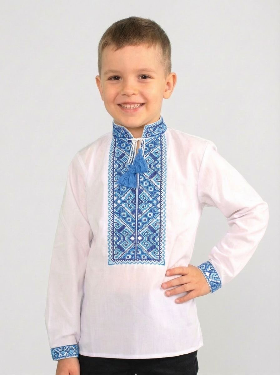 ✅ машинна вишивка гладдю блакитно-синьою ниткою, горловина стійочка з китицями завʼязками, манжети на кнопках