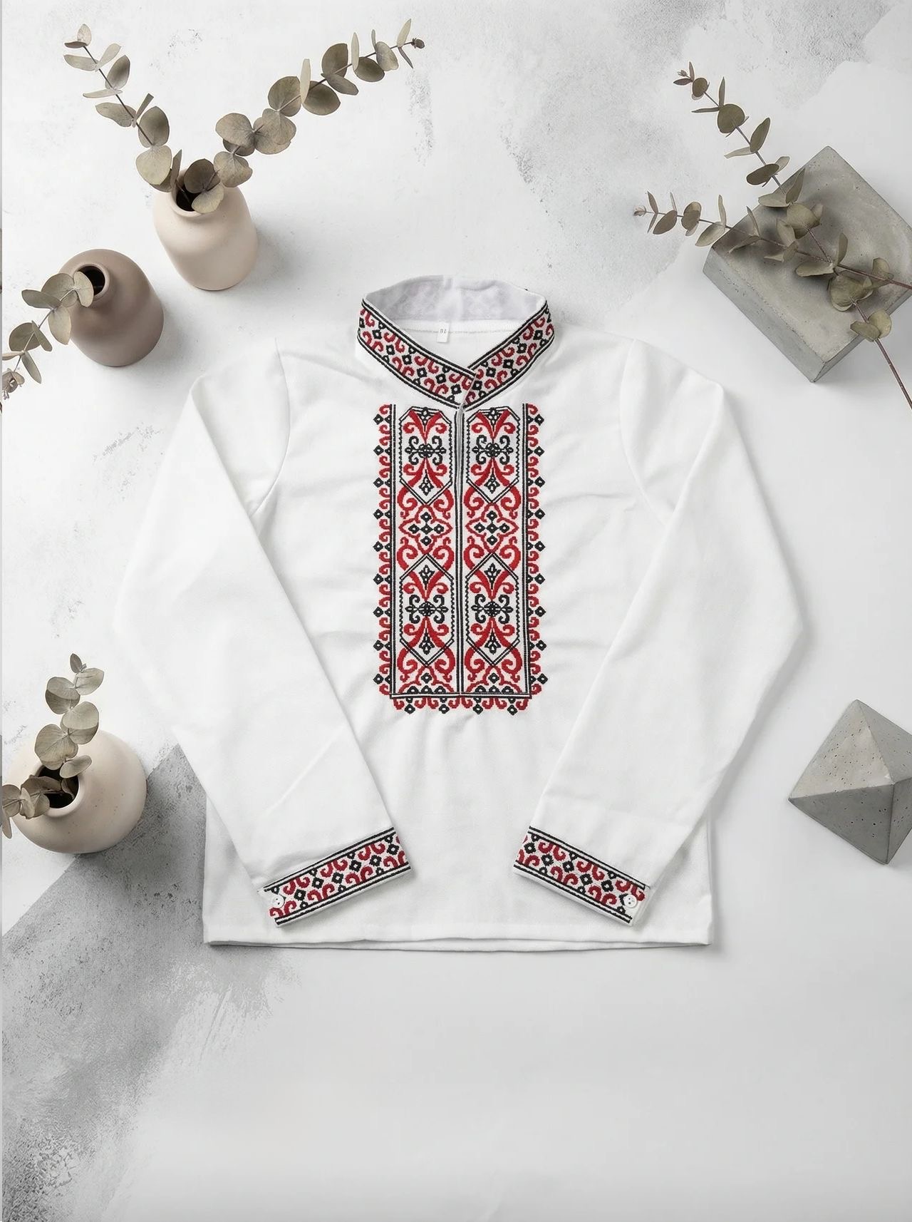 ✅ колір молочний світлий льон, машинна вишивка гладдю червоною та чорною нитками, горловина стійочка, манжети рукава на ґудзиках