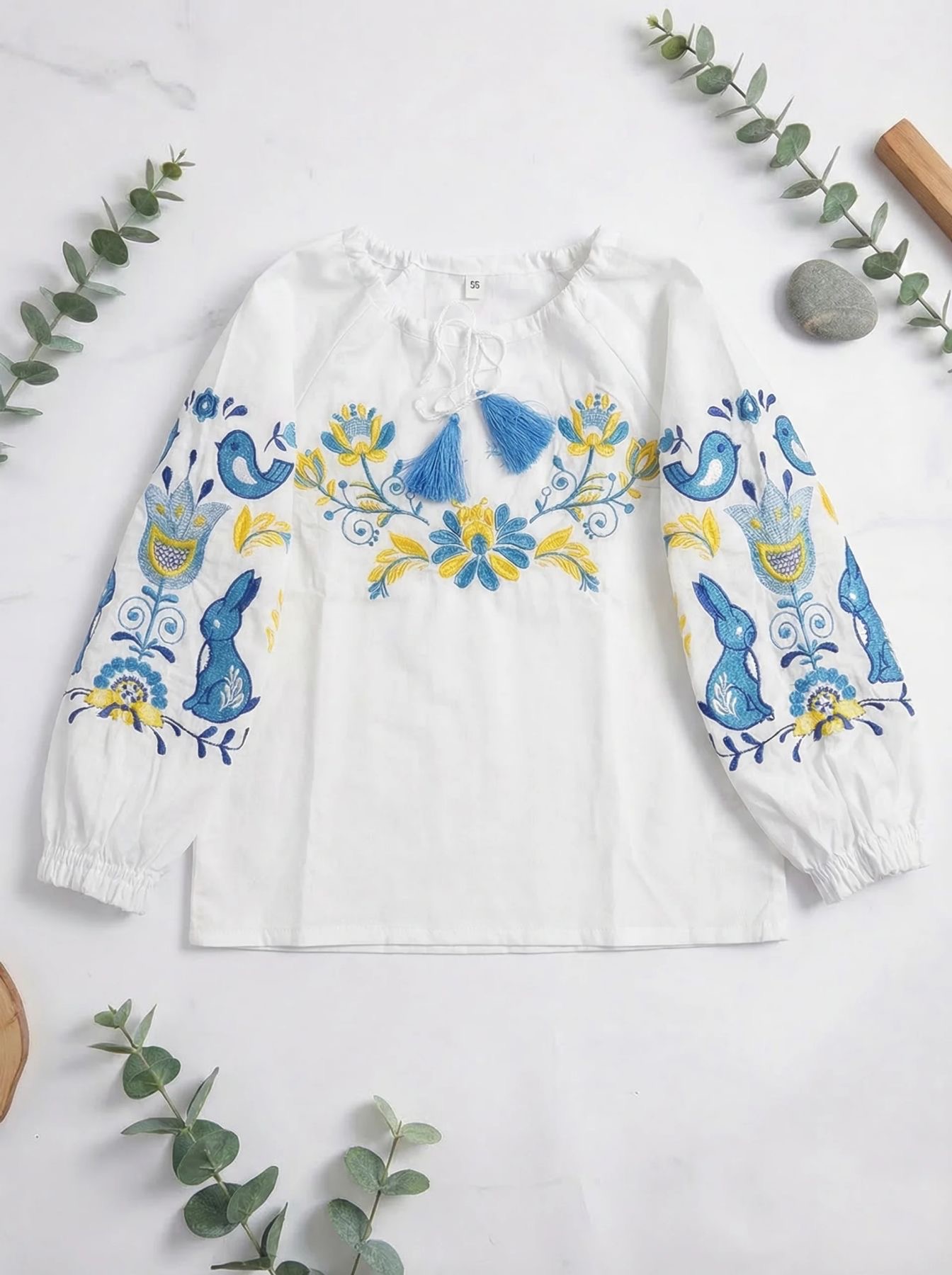 ✅ машинна вишивка гладдю жовтою та блакитною ниткою, горловина затягується та фіксується китицями завʼязками