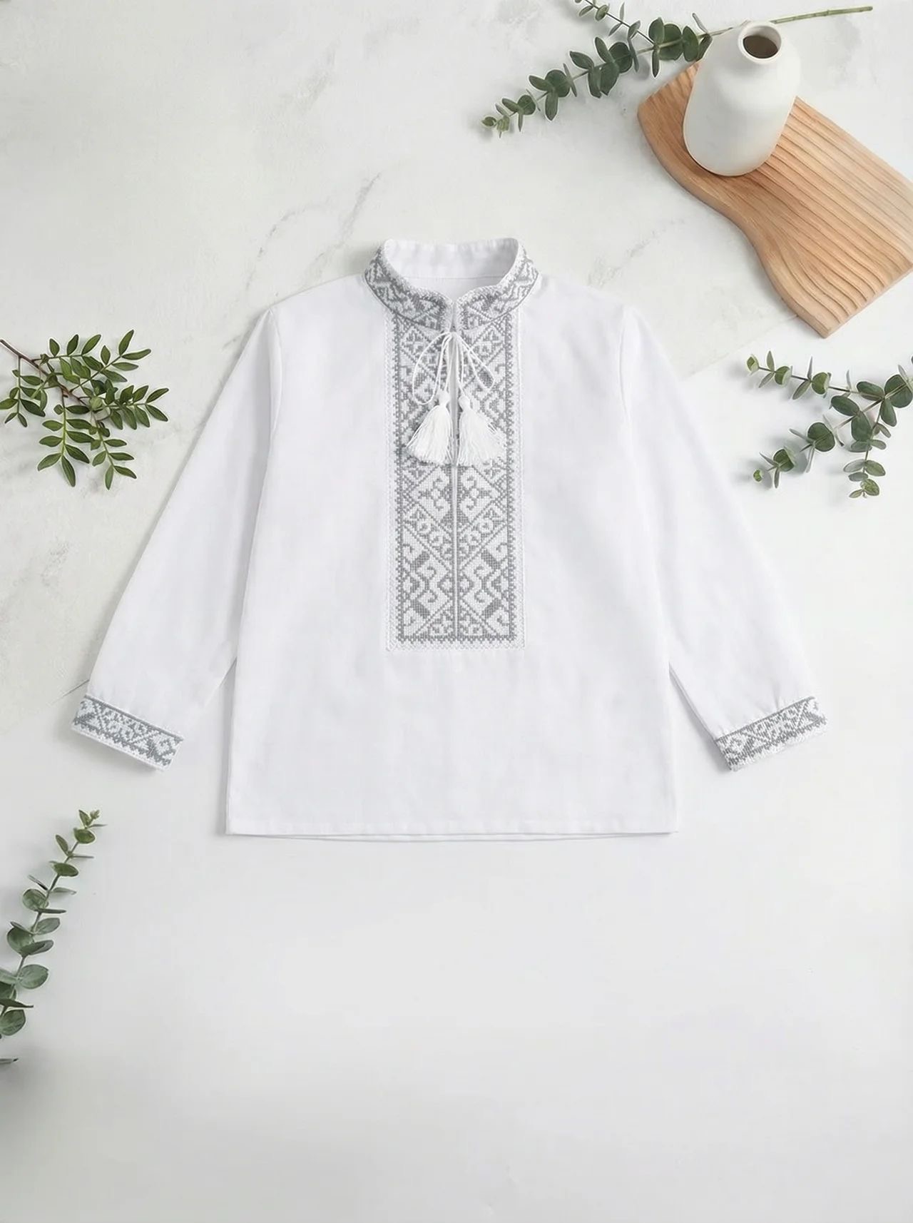 ✅ машинна вишивка хрестиком попелясто-сірою ниткою, горловина стійочка з китицями завʼязками, манжети на кнопках