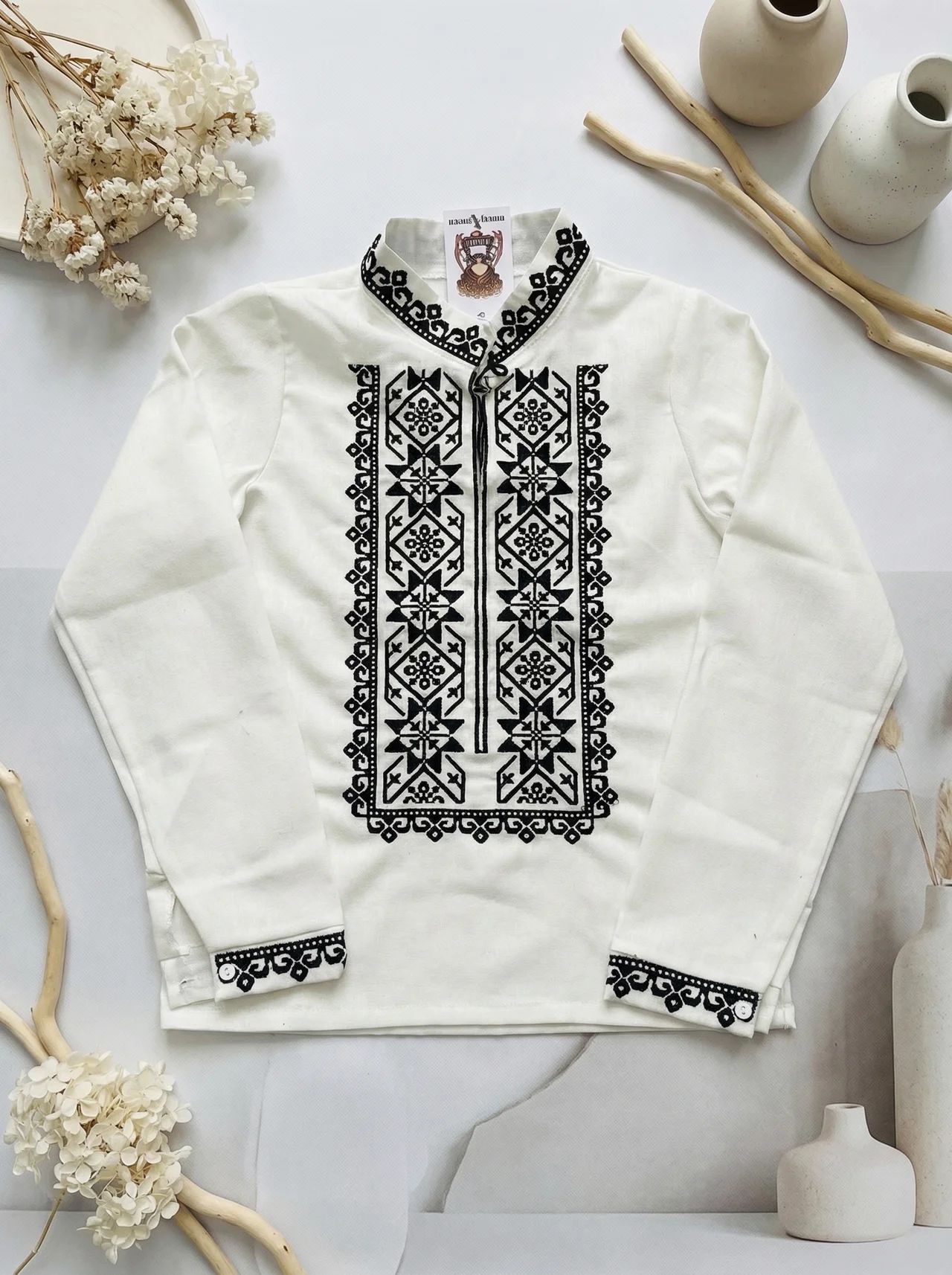 ✅ колір молочний світлий льон, машинна вишивка гладдю чоррими нитками, горловина стійочка, манжети рукава на ґудзиках